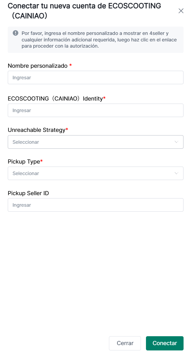 2. Complete la ventana emergente con la información relevante (puede solicitarla al responsable de CaiNiao) y haga clic en ‘Conectar’.