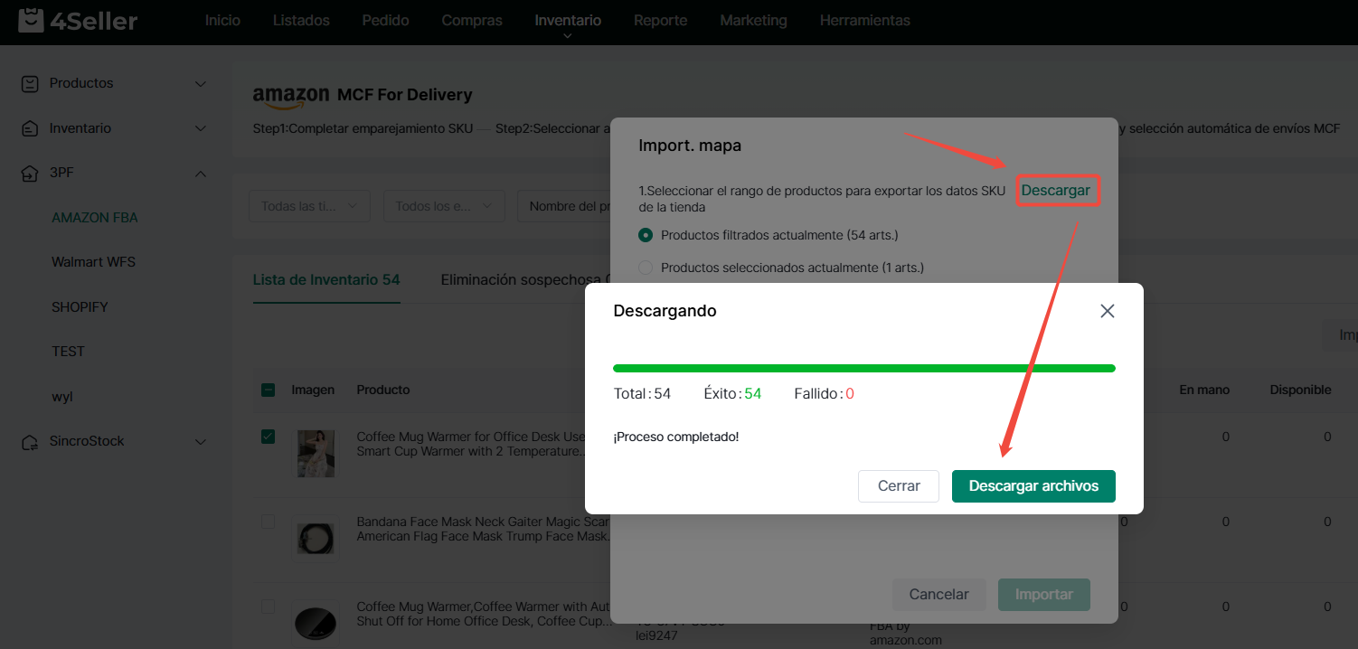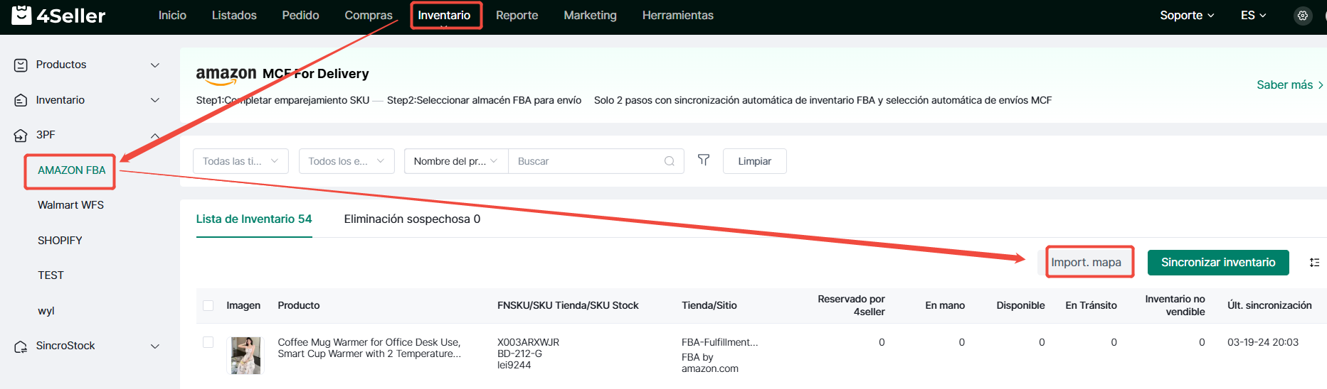 1. Ve a Inventario > 3PF > AMAZON FBA > Importar mapeo.