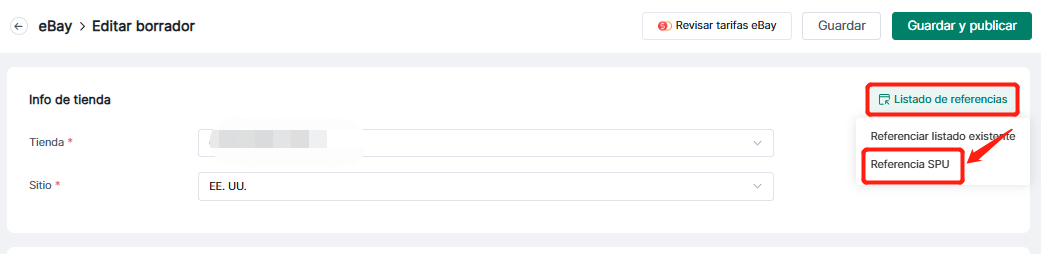 4Seller permite referenciar SPU para listar productos en eBay rápidamente.