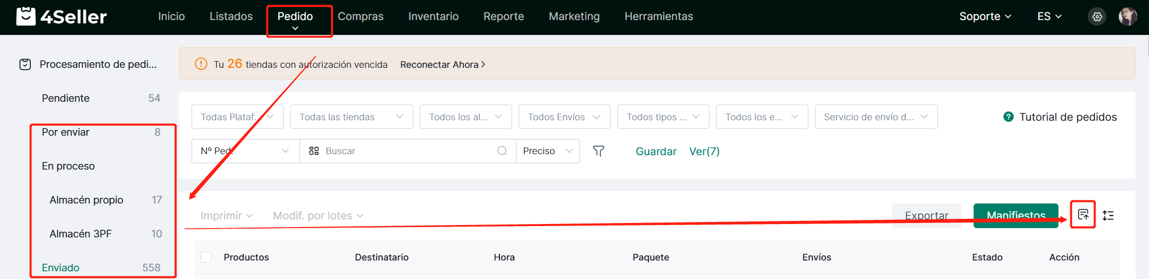 El historial de impresión se ha añadido en la esquina superior derecha de los estados "Por enviar", "En proceso" y "Enviado", permitiéndole revisar cada operación de impresión (incluyendo etiquetas, albaranes y listas de picking).