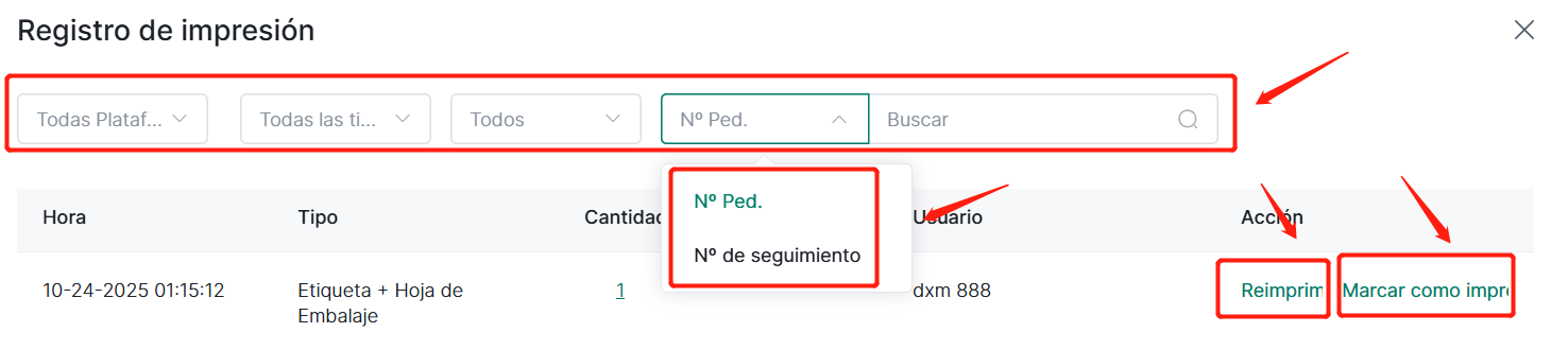 El registro de impresión permite filtrar según los siguientes criterios, y soporta reimpresión y marcado como impreso.
