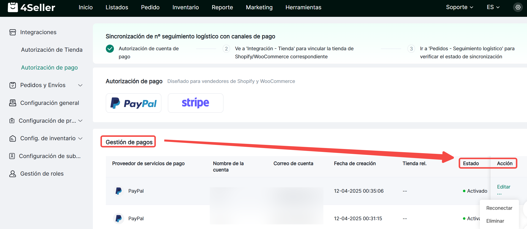 Paso 10: Configuración--Pagos--Gestión de pagos--verificar la cuenta autorizada y el estado, etc.