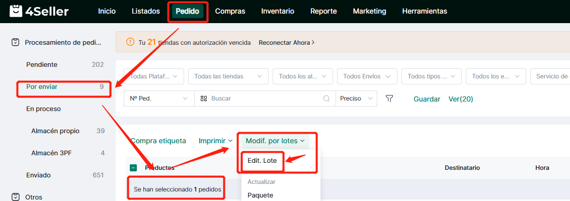 Paso 1: Pedidos -- Para enviar -- Seleccionar pedidos para modificar -- Click en "Edit. Lote"