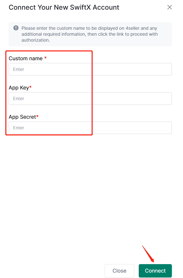 Paso 2: Ingresa nombre del cliente--Contacta al Soporte de SwiftX para obtener App Key y App Secret--Haz clic en "Conectar"