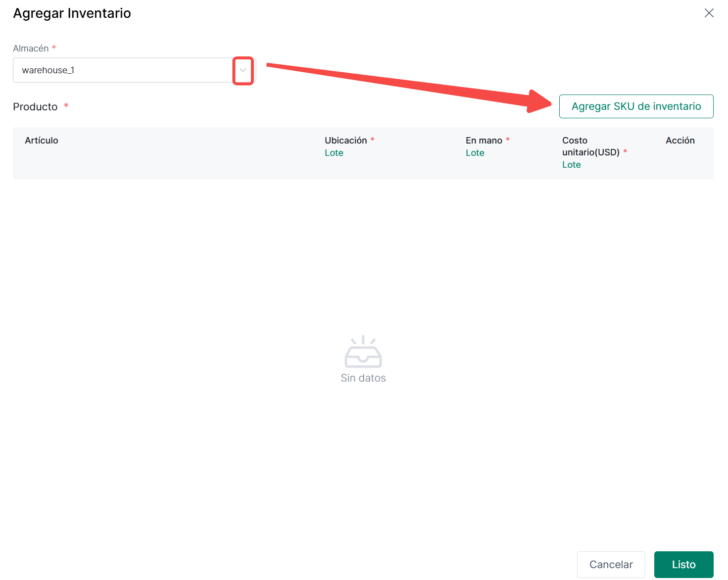 Nota: Al añadir inventario, asegúrese de que el SKU de inventario exista en el producto de inventario. De lo contrario, añada primero los productos de inventario antes de añadir el inventario del producto.