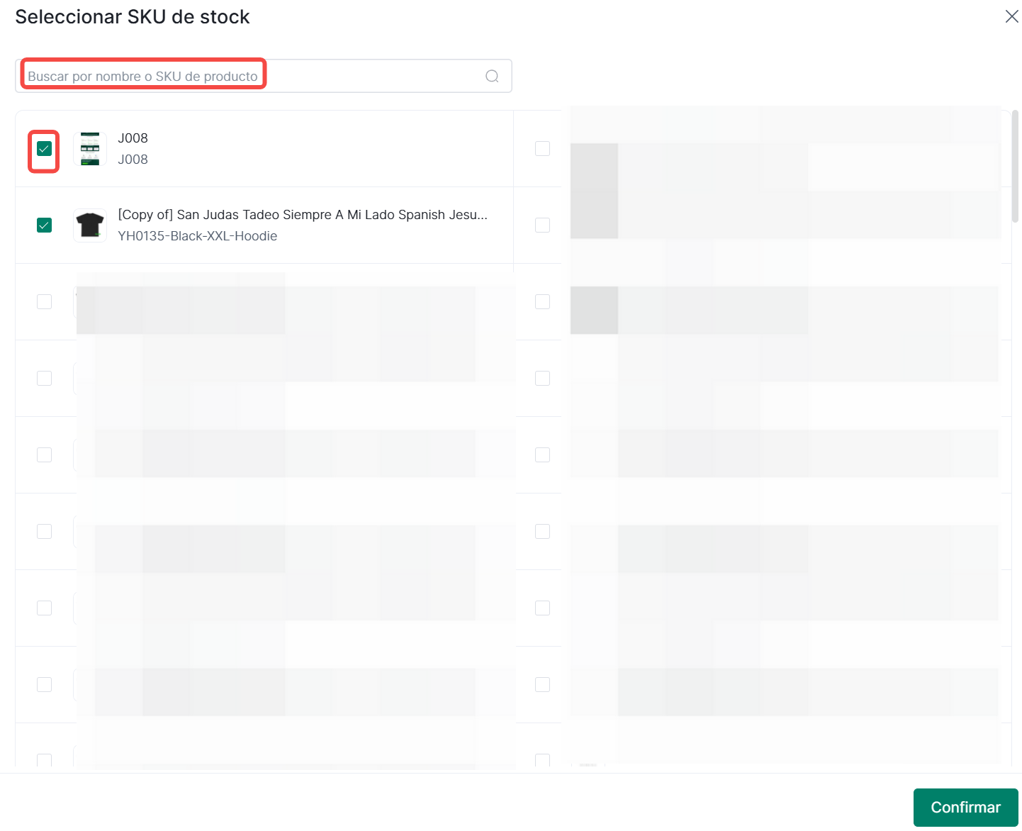 3. En la página Seleccionar SKU, busque por nombre de producto o SKU de Stock. Marque los SKU de inventario a añadir, luego haga clic en Confirmar para añadirlos