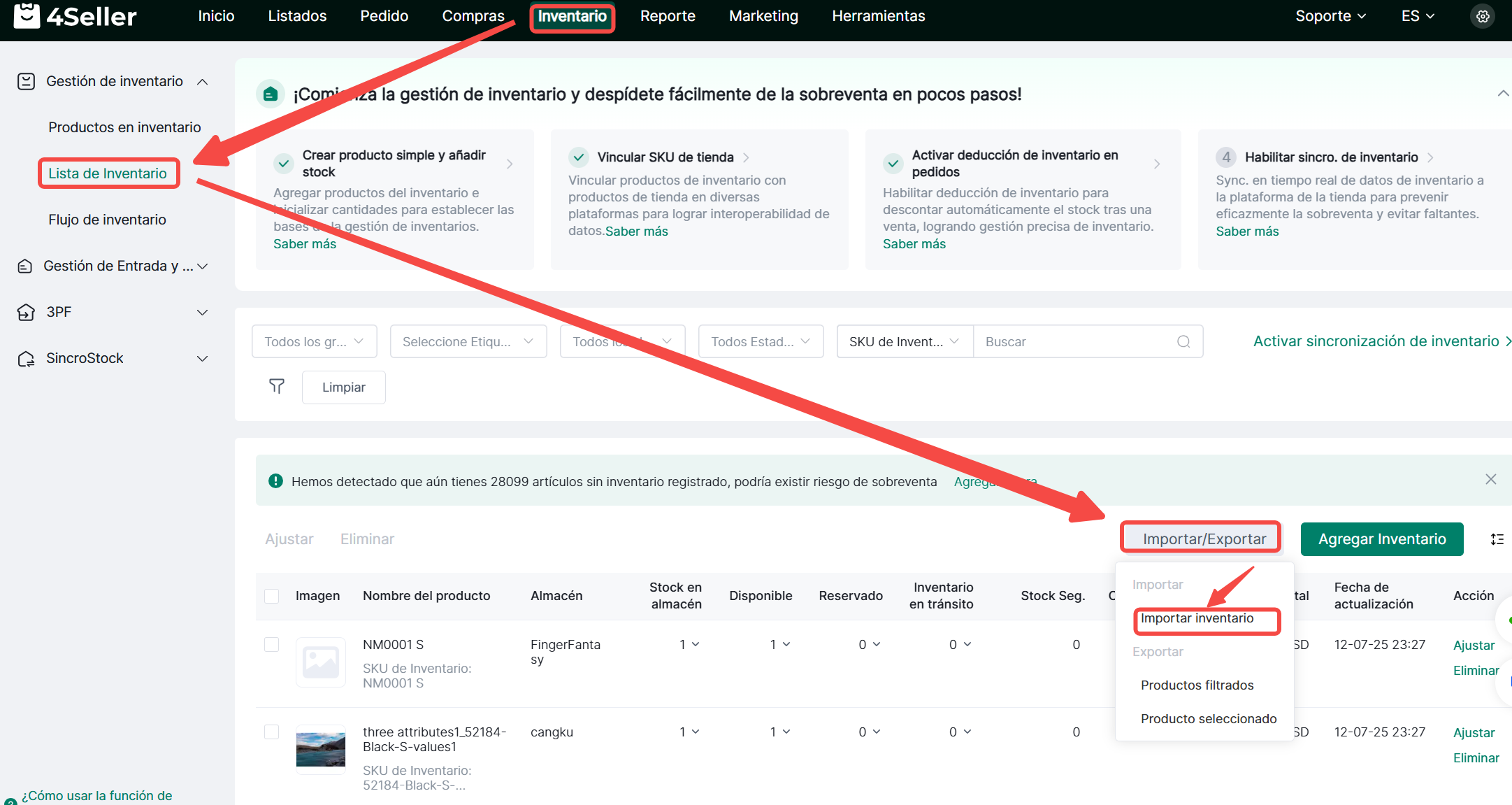 1. Haga clic en Inventario > Lista de Inventario > Importar/Exportar > Importar inventario.