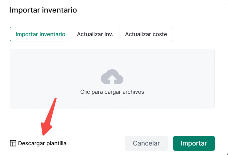 2. Para importar inventario, primero descargue la plantilla. Después de completar la información, cárguela y haga clic en Importar para realizar una importación masiva de inventario.