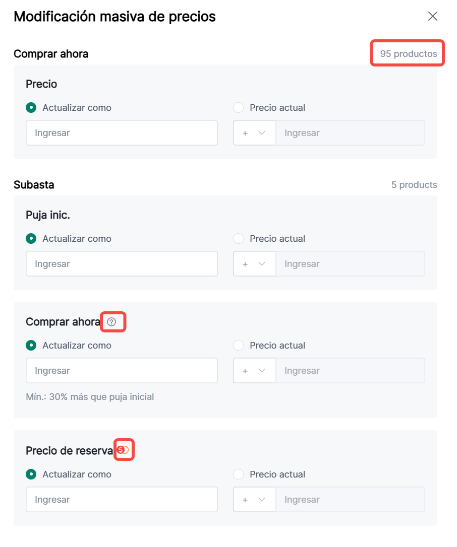 (4) Para subastas con "Actualizar como" puja inicial y precio Compra Ya establecidos, el precio Compra Ya debe ser ≥ 1.3 veces la puja inicial;