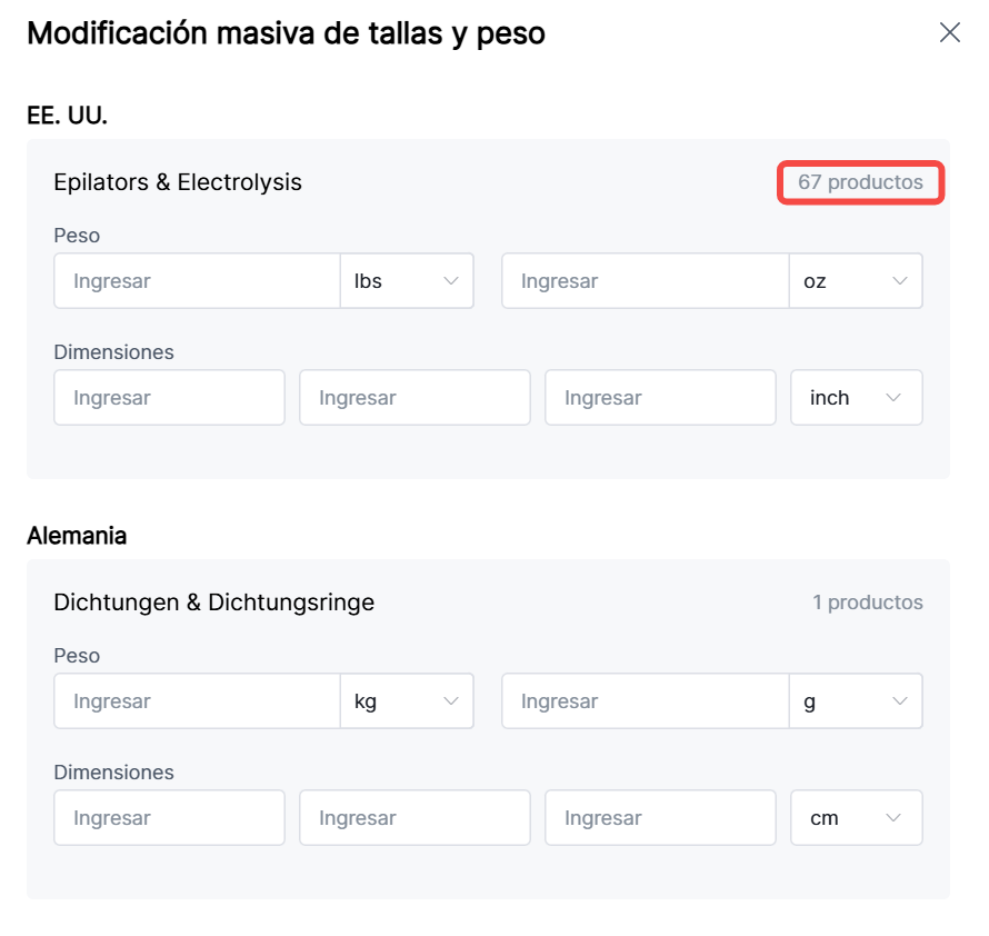 9. Modificación Masiva de Dimensiones y Peso:
