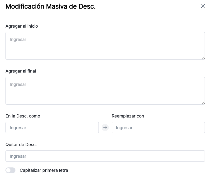 10. Modificación Masiva de Descripciones: Soporta añadir, reemplazar y eliminar contenido