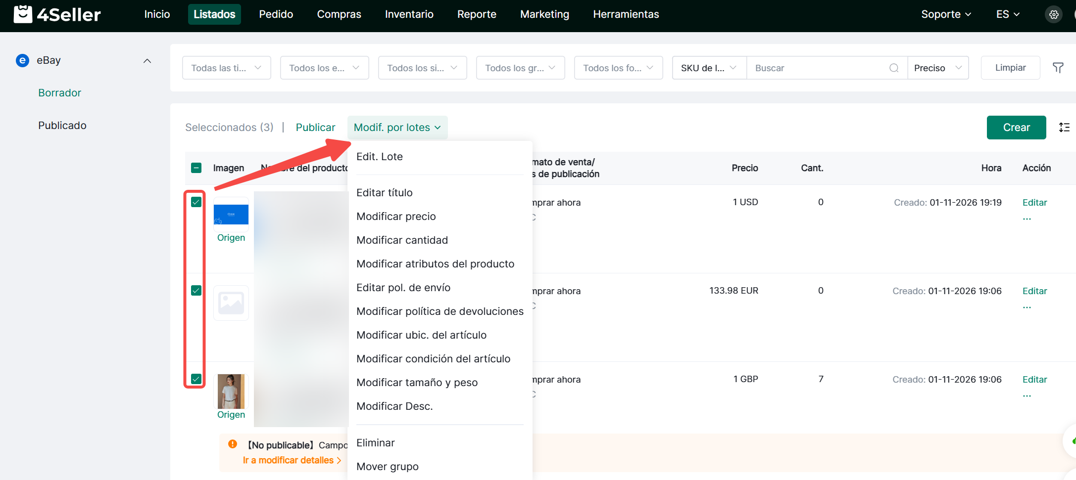 En las páginas de Borradores o Publicados, filtra los productos que requieran operaciones masivas, selecciónalos y haz clic en Acciones en Lote. Elige los atributos a modificar para actualizaciones masivas.