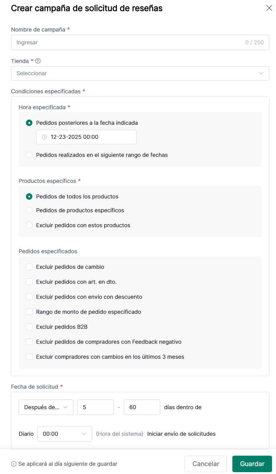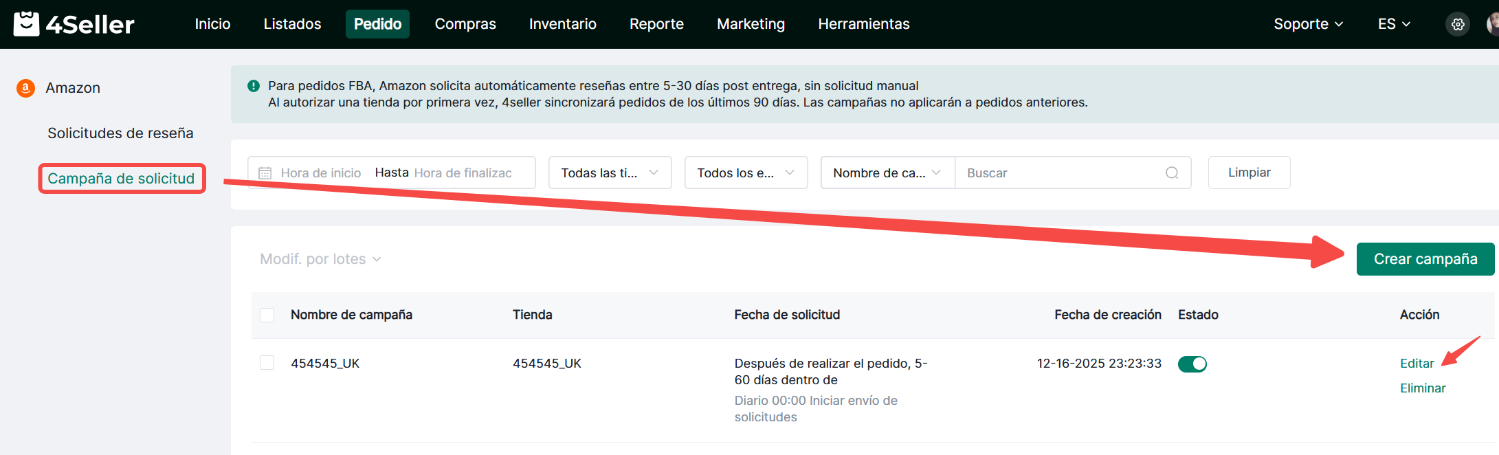 (1) Esta función aplica solo para pedidos FBM. Para pedidos FBA, Amazon envía automáticamente solicitudes de reseña dentro de 5-30 días después de la entrega, eliminando la necesidad de solicitudes manuales.