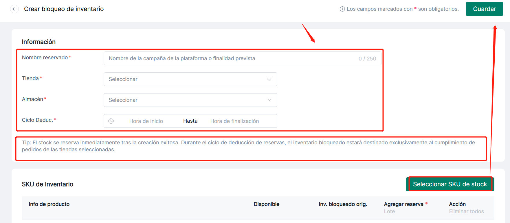 Paso 2: Completa la información del bloqueo: Nombre del bloqueo, Tienda, Almacén, Ciclo de deducción, selecciona el SKU de stock, luego haz clic en Guardar.