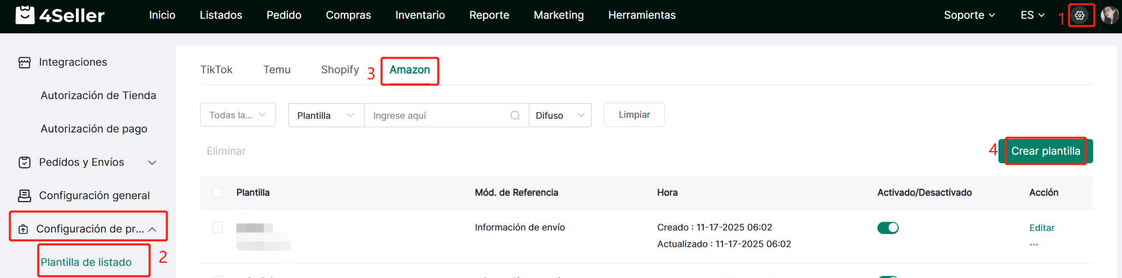 Nota: Si no autorizaste antes, primero debes autorizar tu tienda Amazon en 4Seller para crear plantillas de listado.