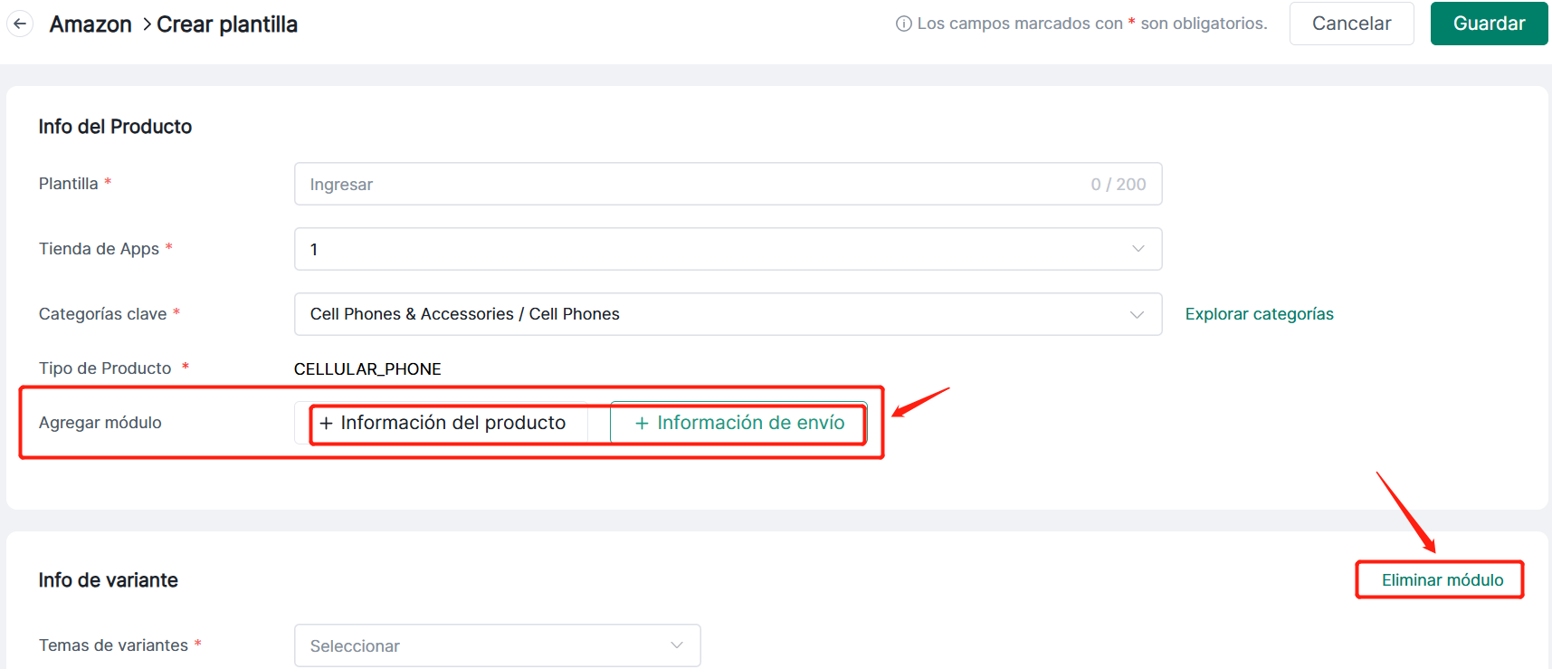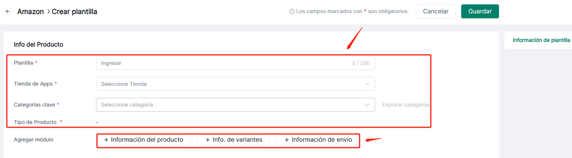 Completa la información de la plantilla: Nombre de plantilla, Tienda, Palabras clave de tipo de producto, Añadir módulo.