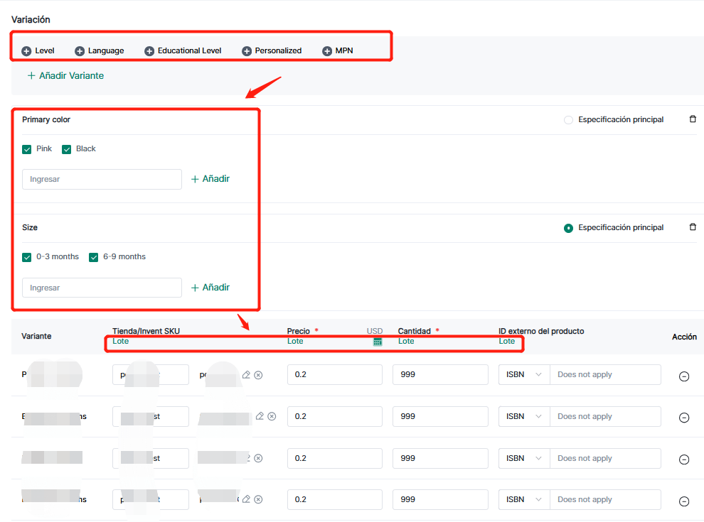 Seleccionar/agregar atributos variantes, soporta llenado batch de SKU tienda/inventario, precio, cantidad, ID producto externo (código identificación depende de categoría).