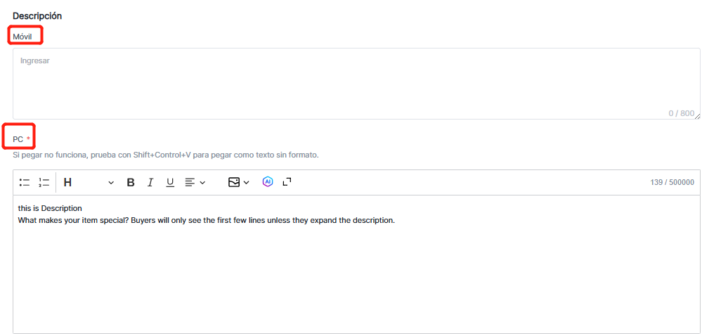 6. Descripción: Requerida para PC, opcional para móvil.