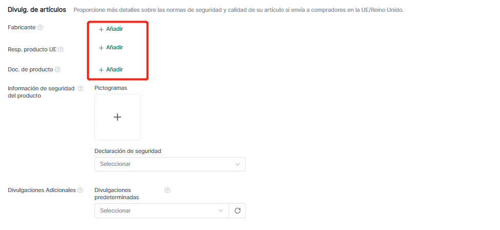 Nota: Si vende a compradores UE/UK, necesitará proporcionar información detallada sobre seguridad y estándares calidad.