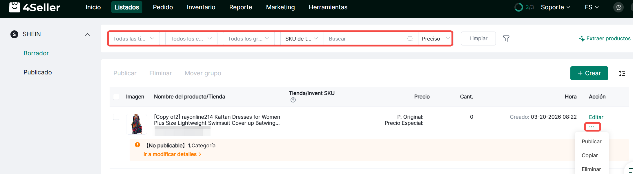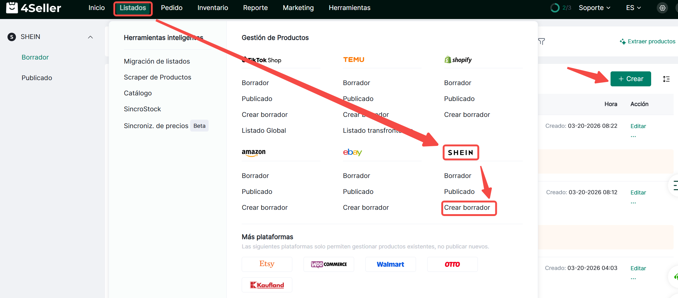 1. Haz clic en Productos > SHEIN > Borradores > Crear Borrador, o haz clic en Crear después de ingresar a la página de productos.