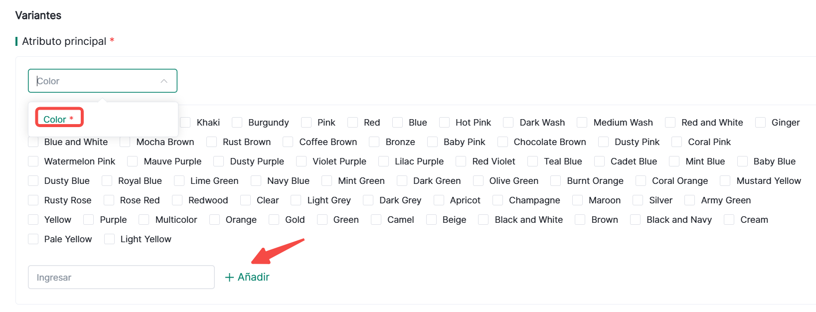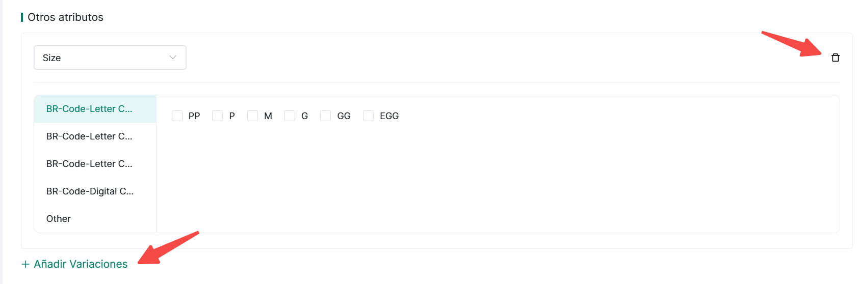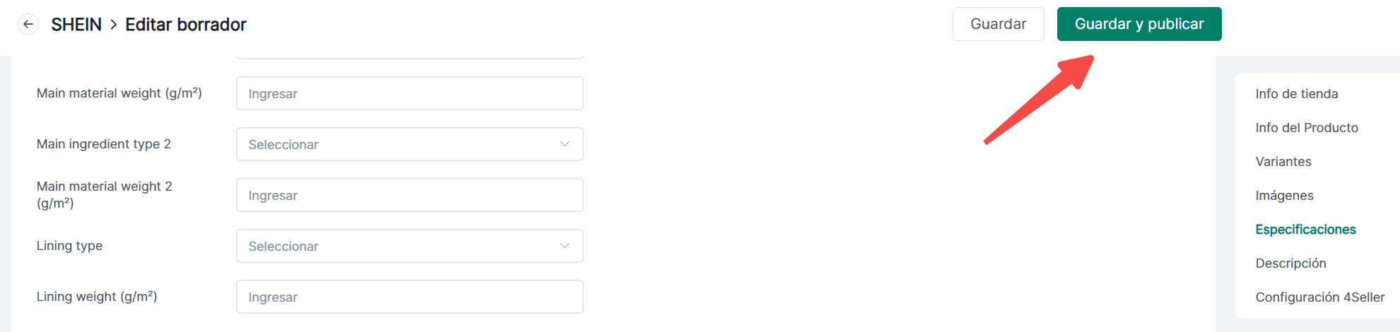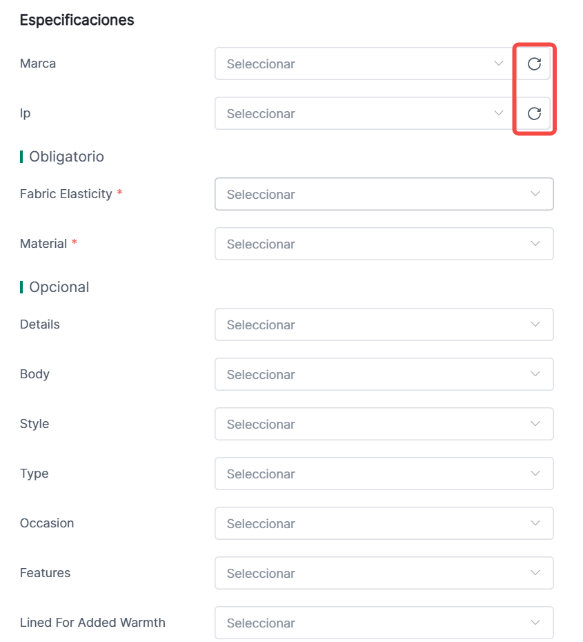 ② Otras Especificaciones: Los items marcados en rojo son atributos obligatorios. Puedes añadir atributos personalizados o eliminarlos según sea necesario.