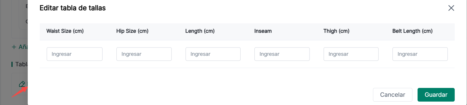 ③ Tabla de Tallas: Haz clic en el botón "Editar" para ingresar información de tallas.