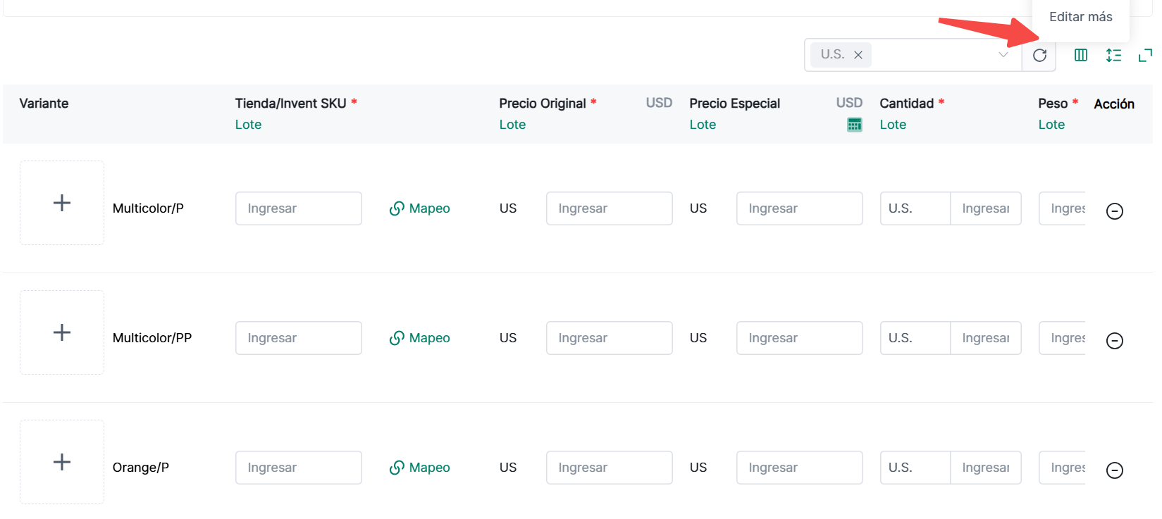 ④ Variantes: Genera variantes basadas en los atributos seleccionados. Haz clic en "Actualizar Almacén" para completar información relevante; también puedes hacer clic en "Edición Pantalla Completa" o usar procesamiento por lotes. Haz clic en "Emparejar SKU de Inventario"