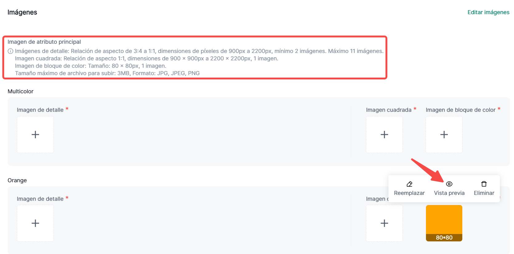 ⑤ Imágenes: Los items marcados en rojo son imágenes obligatorias. Si el número de atributos para la especificación principal es ≥2, se debe proporcionar una imagen de muestra de color. Diferentes imágenes deben completarse según los requisitos relevantes. Haz clic en "Editar Imágenes" para ajustar dimensiones de imágenes por lotes.