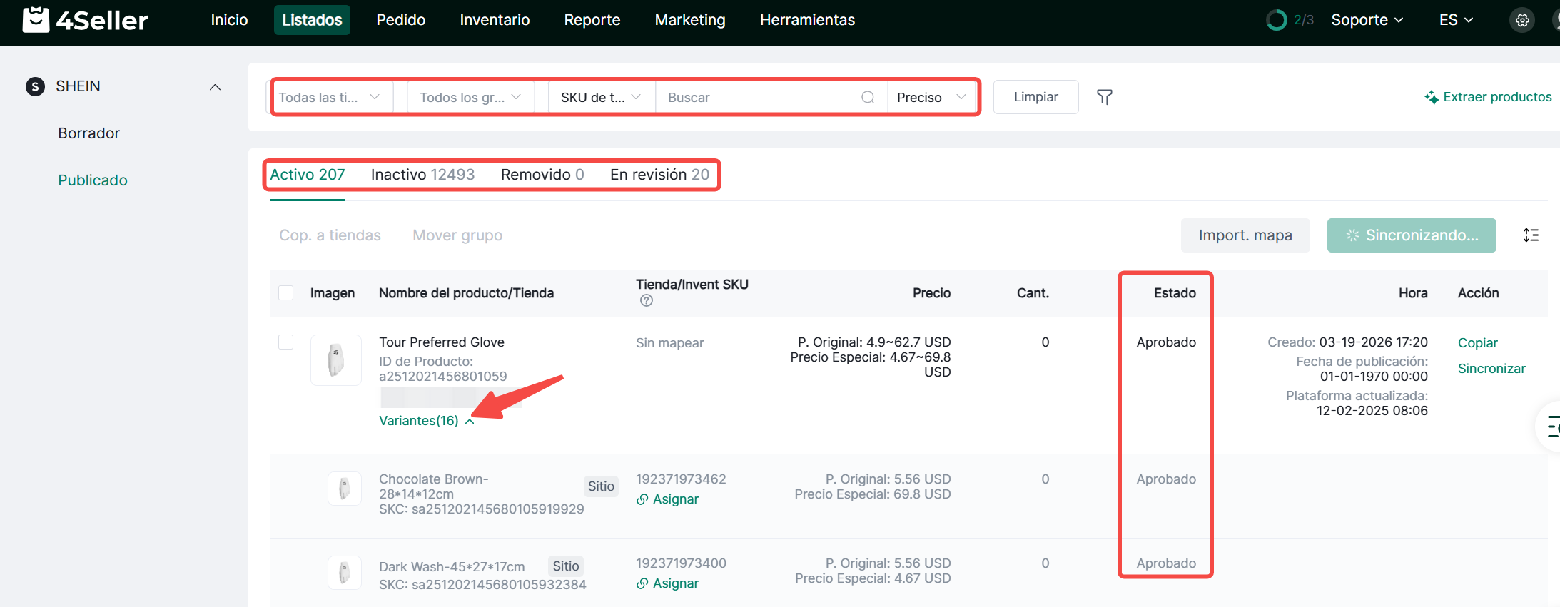 (2) Tras una publicación exitosa, el producto aparecerá en la lista Publicados. Haz clic en "Variantes" para expandir y ver el estado de publicación de cada variante. Haz clic en 'Copiar' para copiar información del producto a la sección Borradores, o haz clic en "Sincronizar" para actualizar la información de la plataforma en la página de listado.