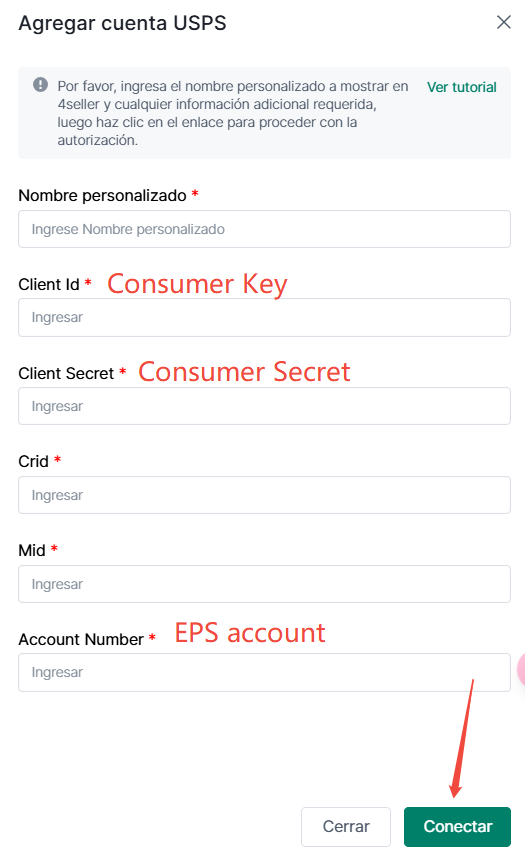Accede al portal de desarrolladores de USPS https://developer.usps.com/. Tras iniciar sesión, haz clic en APPS y selecciona la aplicación correspondiente para ver estos datos.