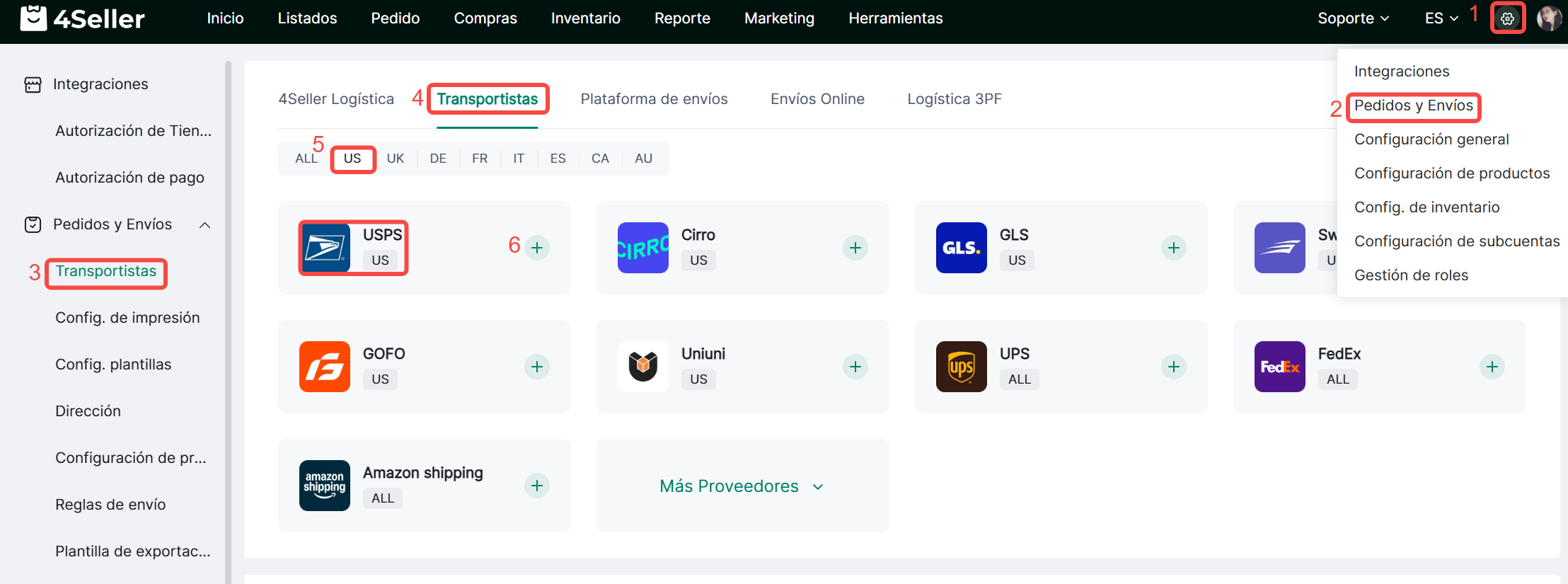 4. Inicia sesión en 4Seller, haz clic en Configuración-Órdenes&Envíos-Transportistas-Transportistas Principales-busca USPS NUEVO y haz clic en agregar