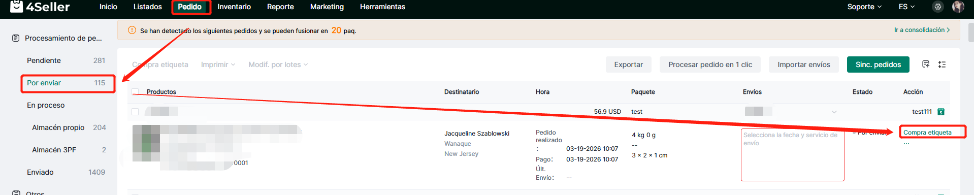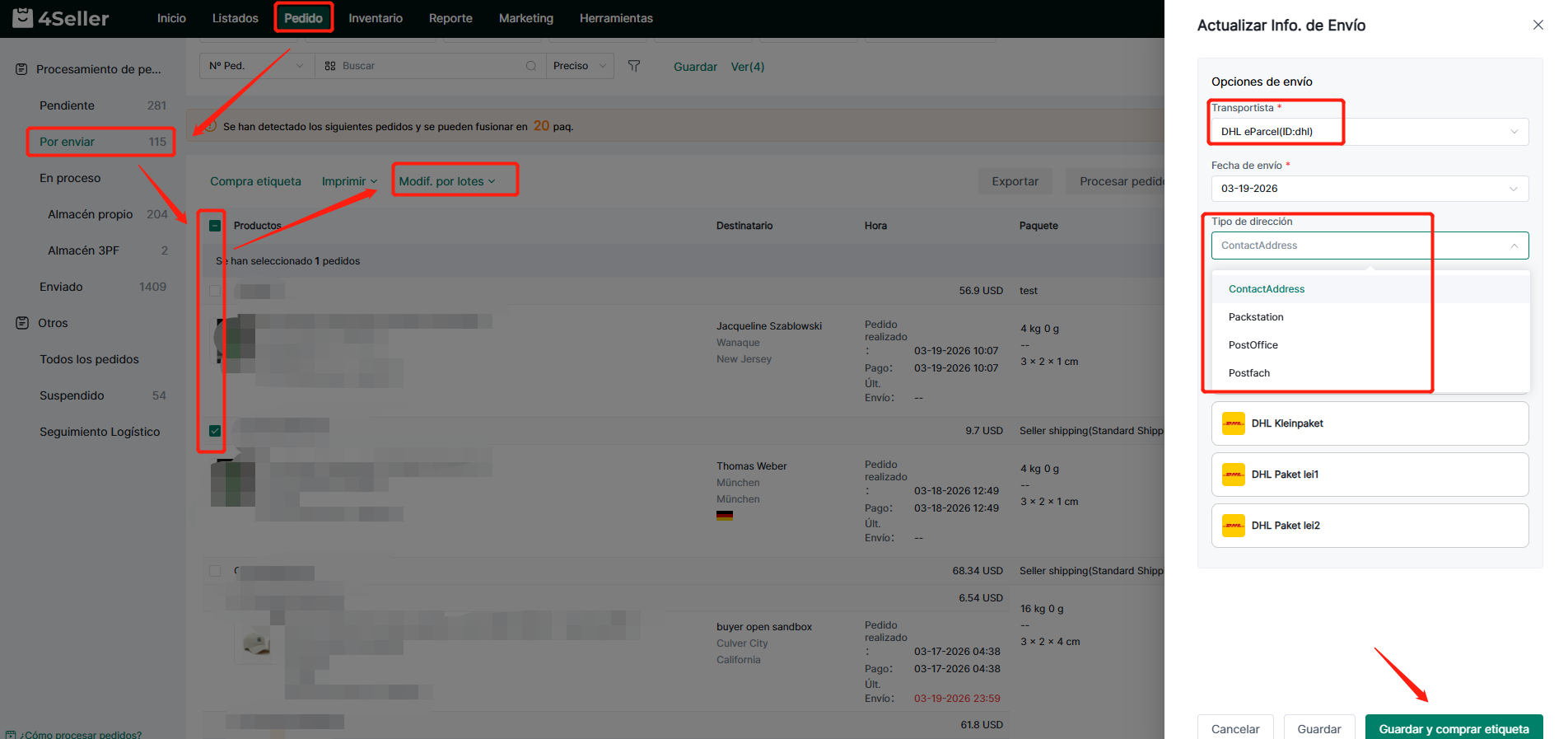 Comprar etiquetas al por mayor: Pedido - Seleccionar algunos pedidos y todos los pedidos - Hacer clic en "Modif. por lotes" - Información de envío - Seleccionar información de envío - Soporte - Seleccionar tipo de dirección - Seleccionar servicios de envío - Hacer clic en "Guardar y comprar etiquetas"