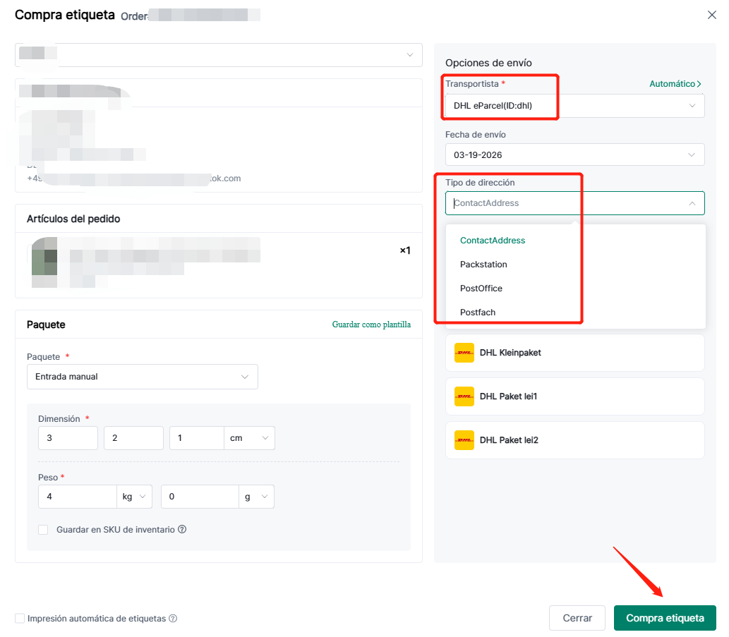 Paso 3: Comprar etiqueta individual: Pedido--Comprar etiqueta--Seleccionar DHL eParcel--Soporte, seleccionar Tipo de dirección--Seleccionar Servicios de envío--Hacer clic en "Comprar etiqueta"