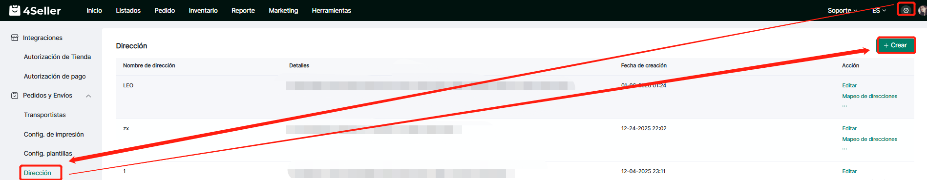 Inicie sesión en 4Seller, haga clic en Configuración - Pedidos y envío - Dirección, ingrese a la página de configuración de dirección, si no tiene dirección, puede configurarla, haga clic en "Crear".