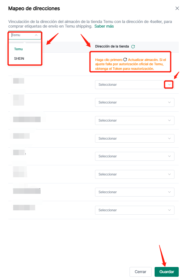 Debido a que el envío en línea de Temu & Shein solo puede seleccionar direcciones de envío creadas en el panel de vendedor de Temu & Shein, es necesario asociar las direcciones de Temu & Shein con las direcciones de 4Seller.