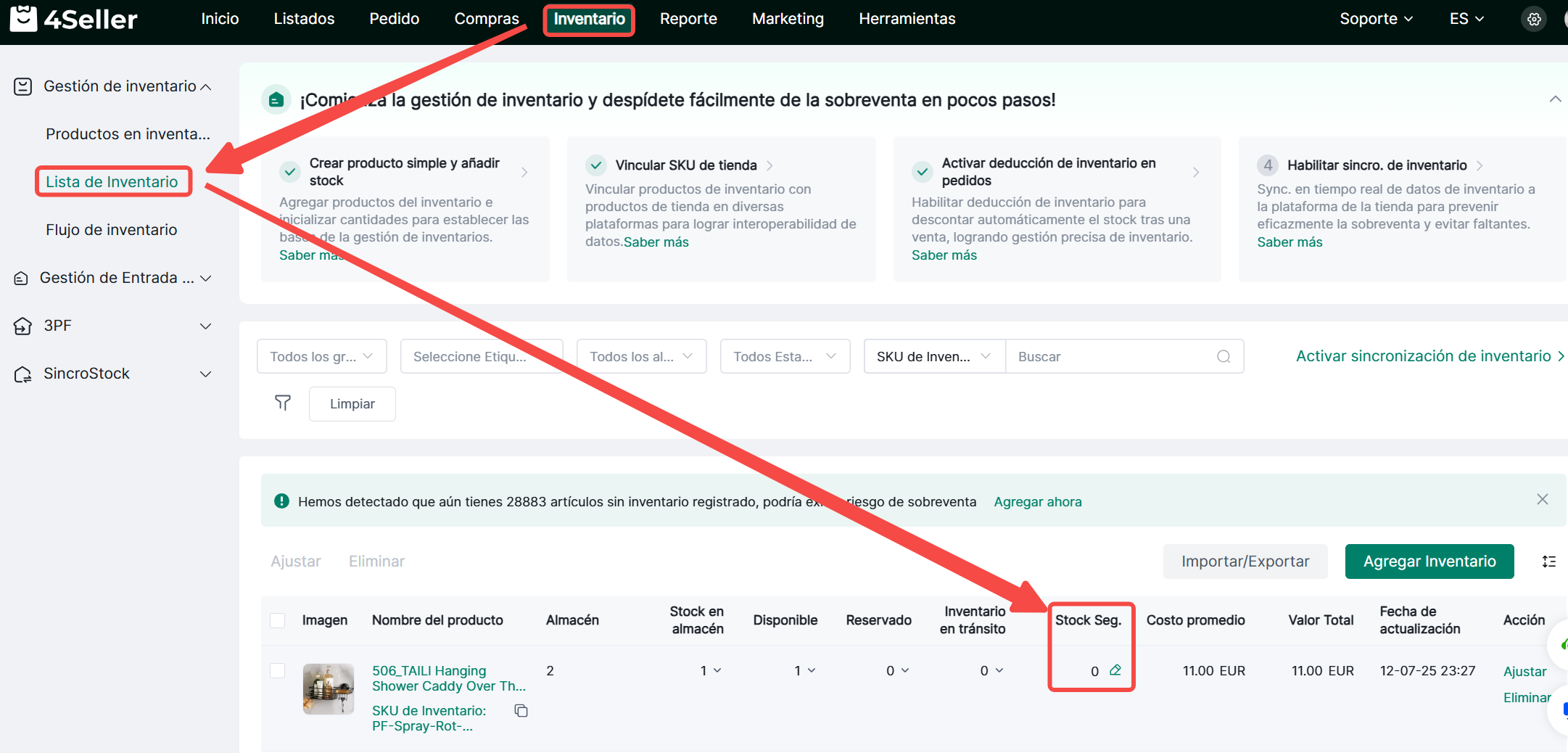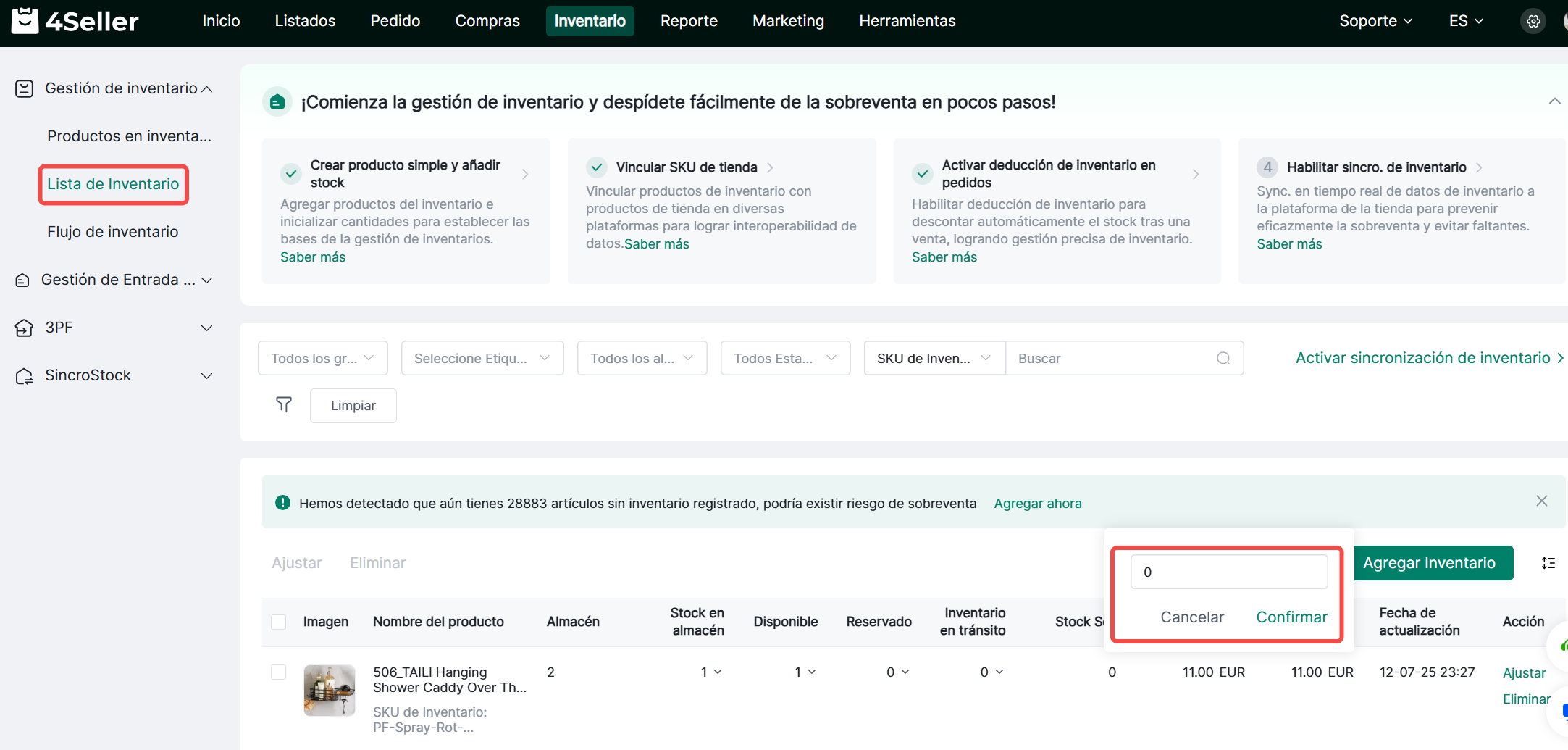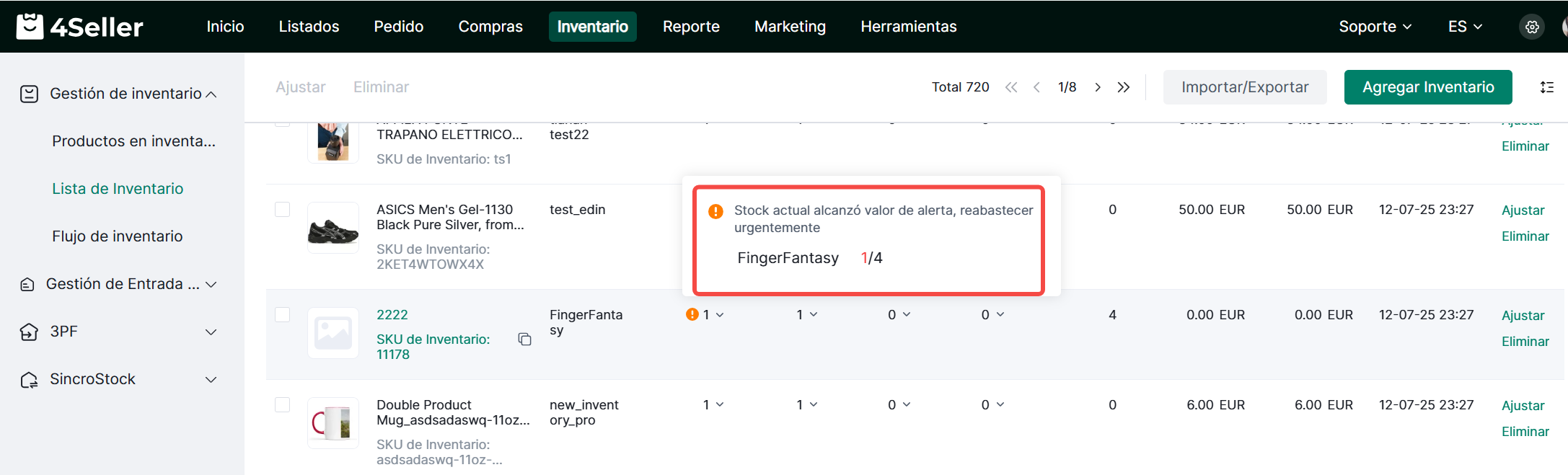 4Seller permite configurar umbrales de alerta de inventario para las cantidades en stock de los SKU. Cuando la cantidad en stock de un SKU alcanza el umbral de alerta, se activará una alerta de inventario.