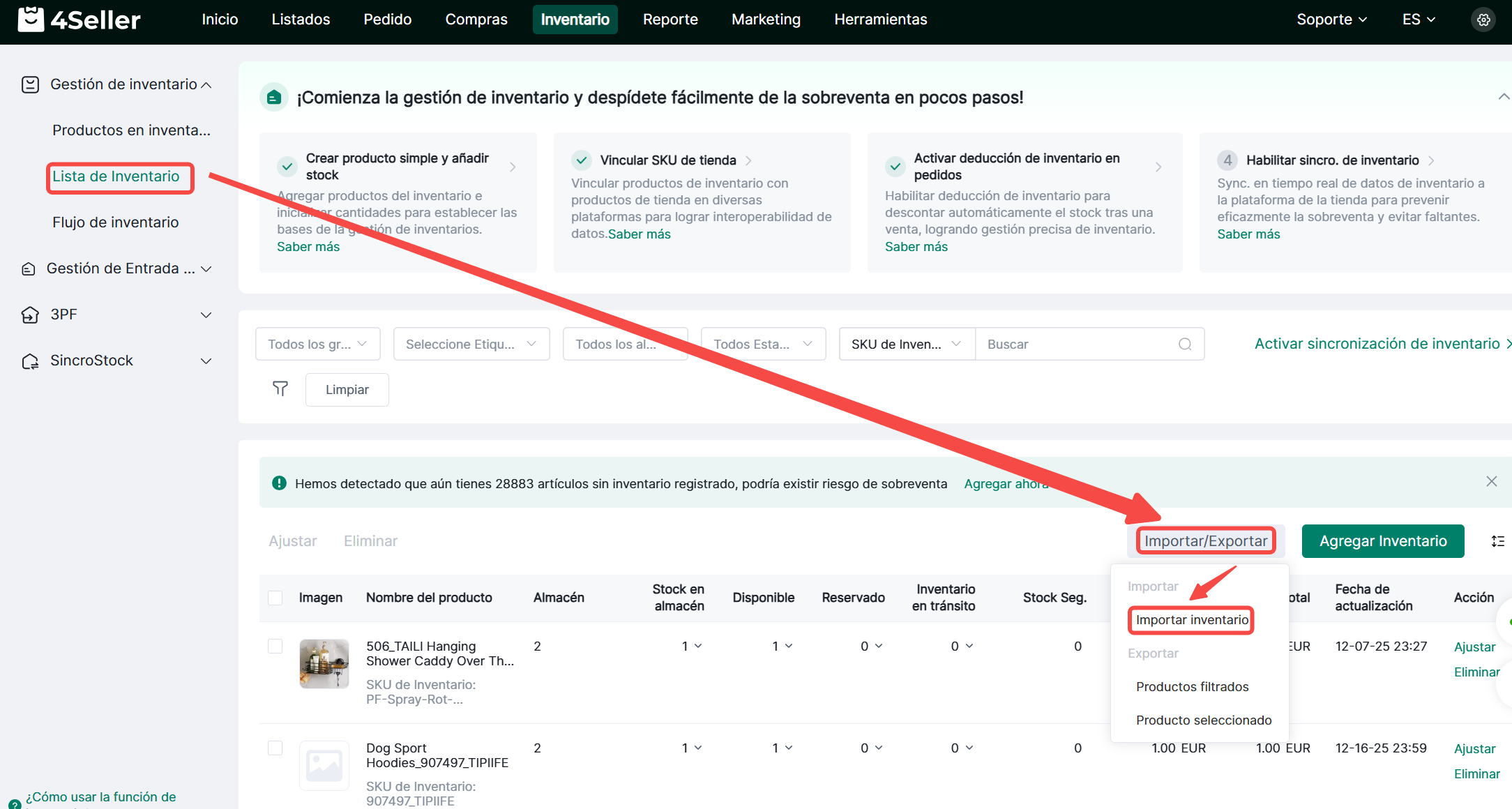 1. Navega a Inventario > Lista de Inventario > Importar/Exportar > Importar Inventario