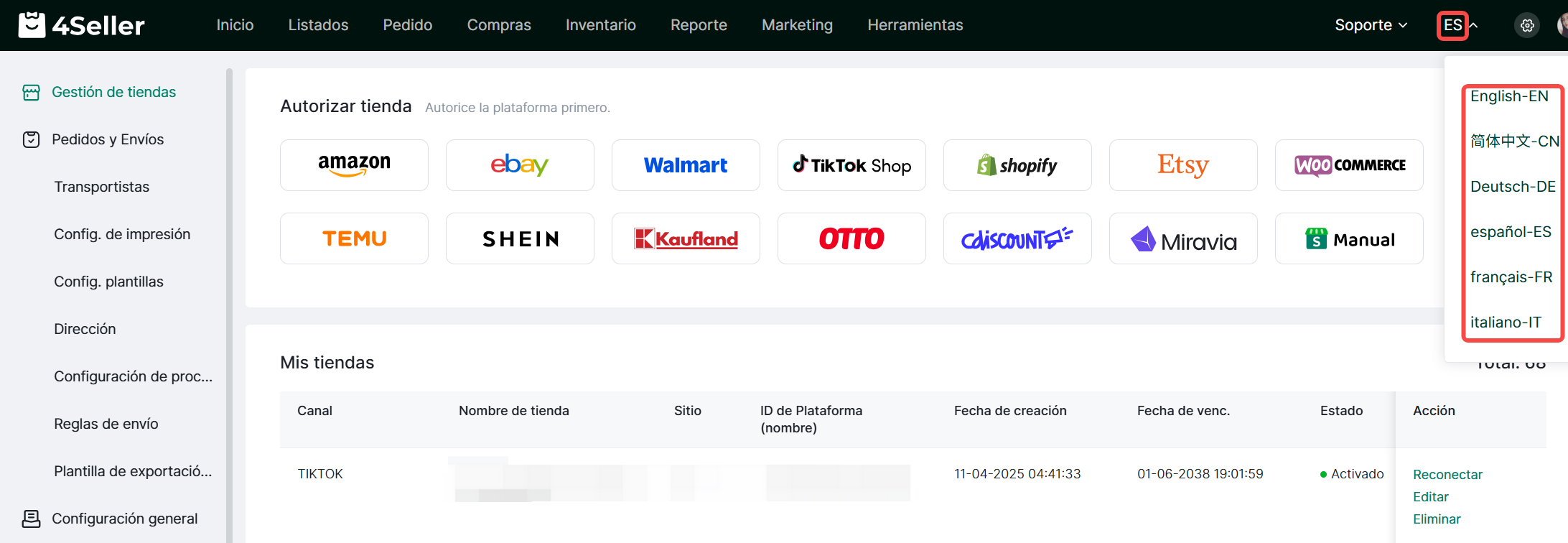 ⑥Haga clic en el icono de perfil situado en la esquina superior derecha para acceder a los detalles de su cuenta (su dirección de correo electrónico sirve como nombre de usuario de 4Seller), donde podrá actualizar su número de teléfono móvil y contraseña.