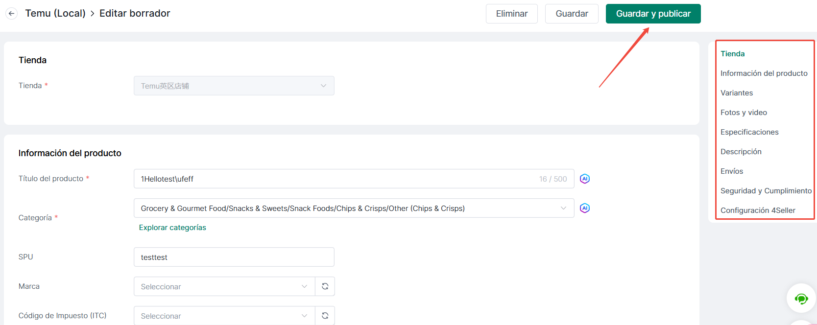 8. Modifica la información en las secciones: Info del producto, Variantes, Fotos y video, Especificaciones, Descripción, Envío ······.