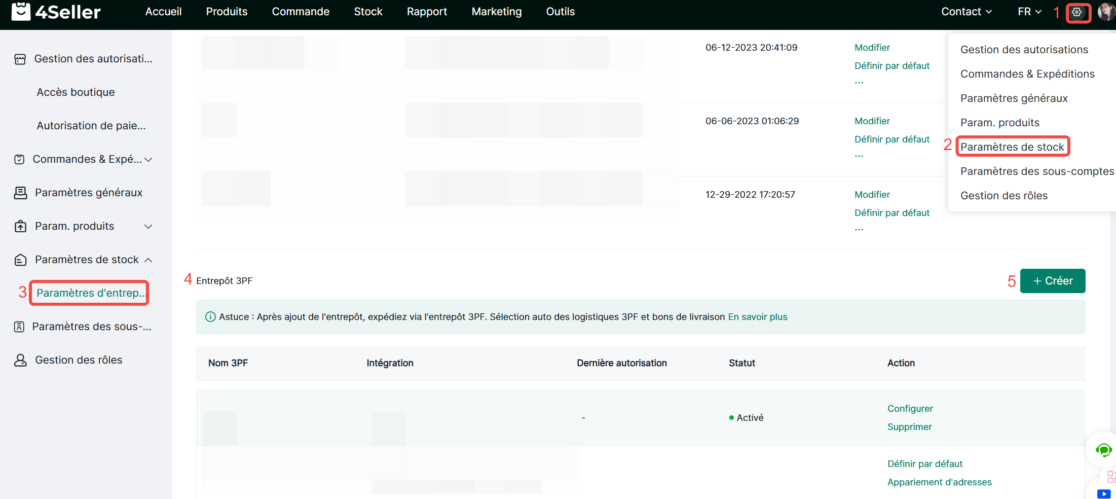 Accédez à la page Paramètres d'inventaire, recherchez l'entrepôt 3PF et cliquez sur Créer pour ajouter l'entrepôt FBA.