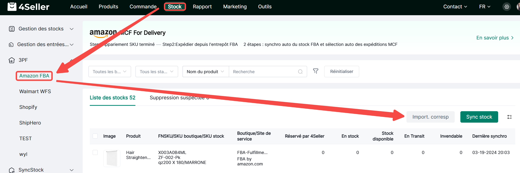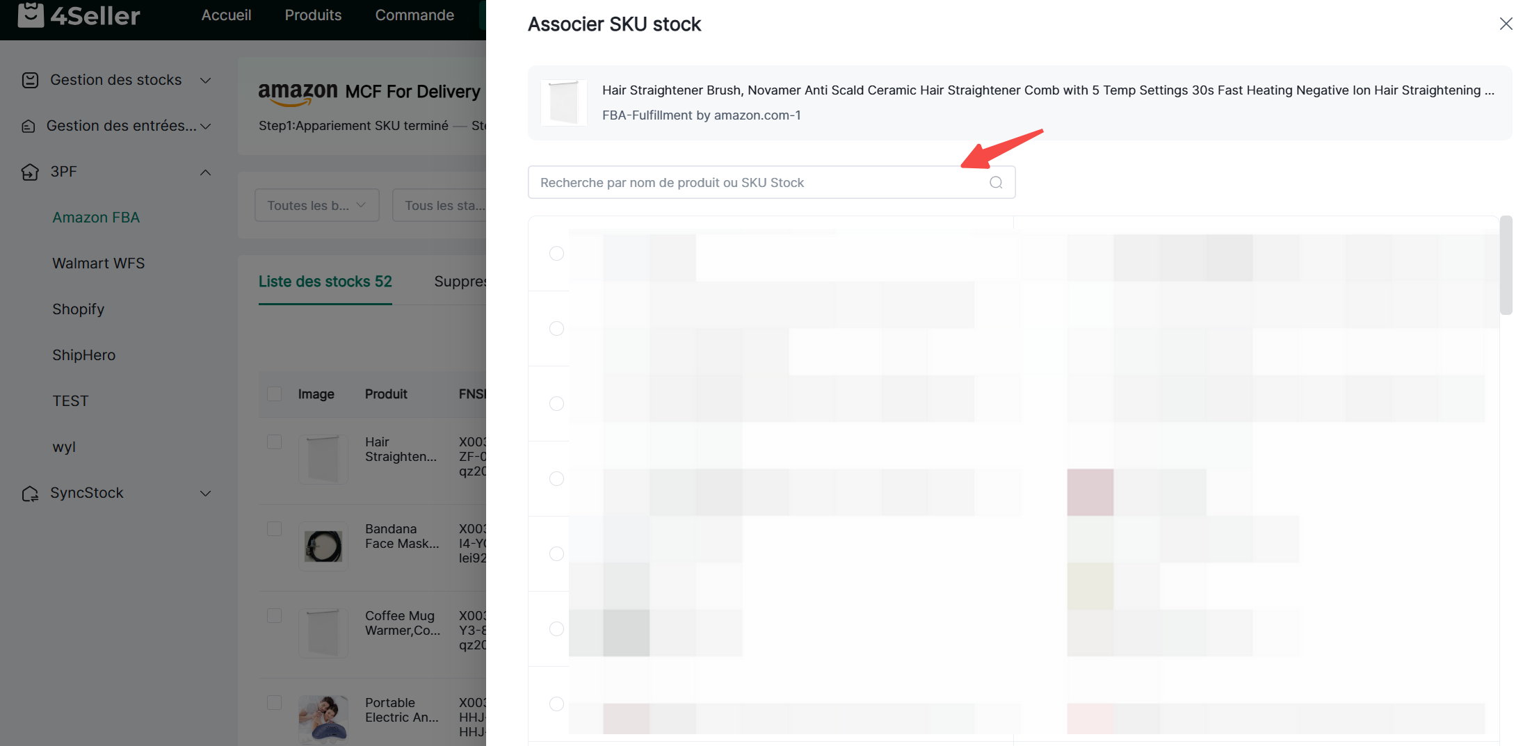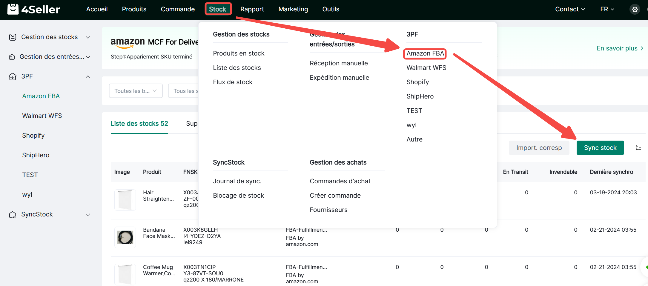 Cliquez sur Stocks pour accéder à la page de l'entrepôt 3PF, cliquez sur Synchroniser les stocks pour synchroniser les stocks de 3PF avec 4Seller, puis cliquez sur la référence du stock pour associer la référence du produit.