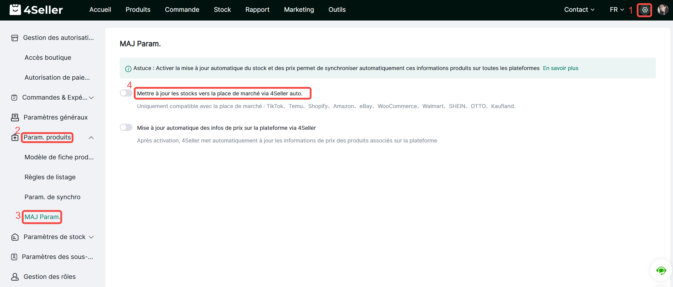 Paramètres -- Paramètres d'inscription -- Paramètres de mise à jour -- Ouvrez le bouton « Mettre à jour automatiquement les informations sur les stocks vers la plateforme depuis 4Seller ».