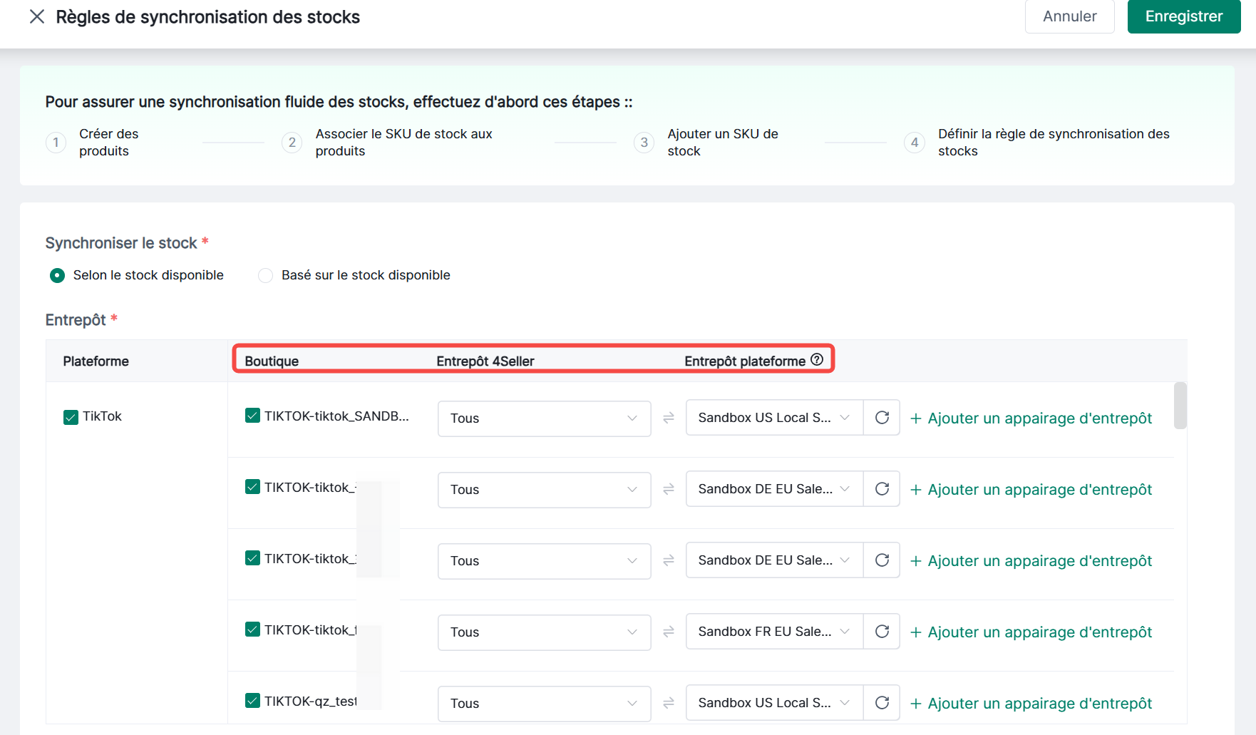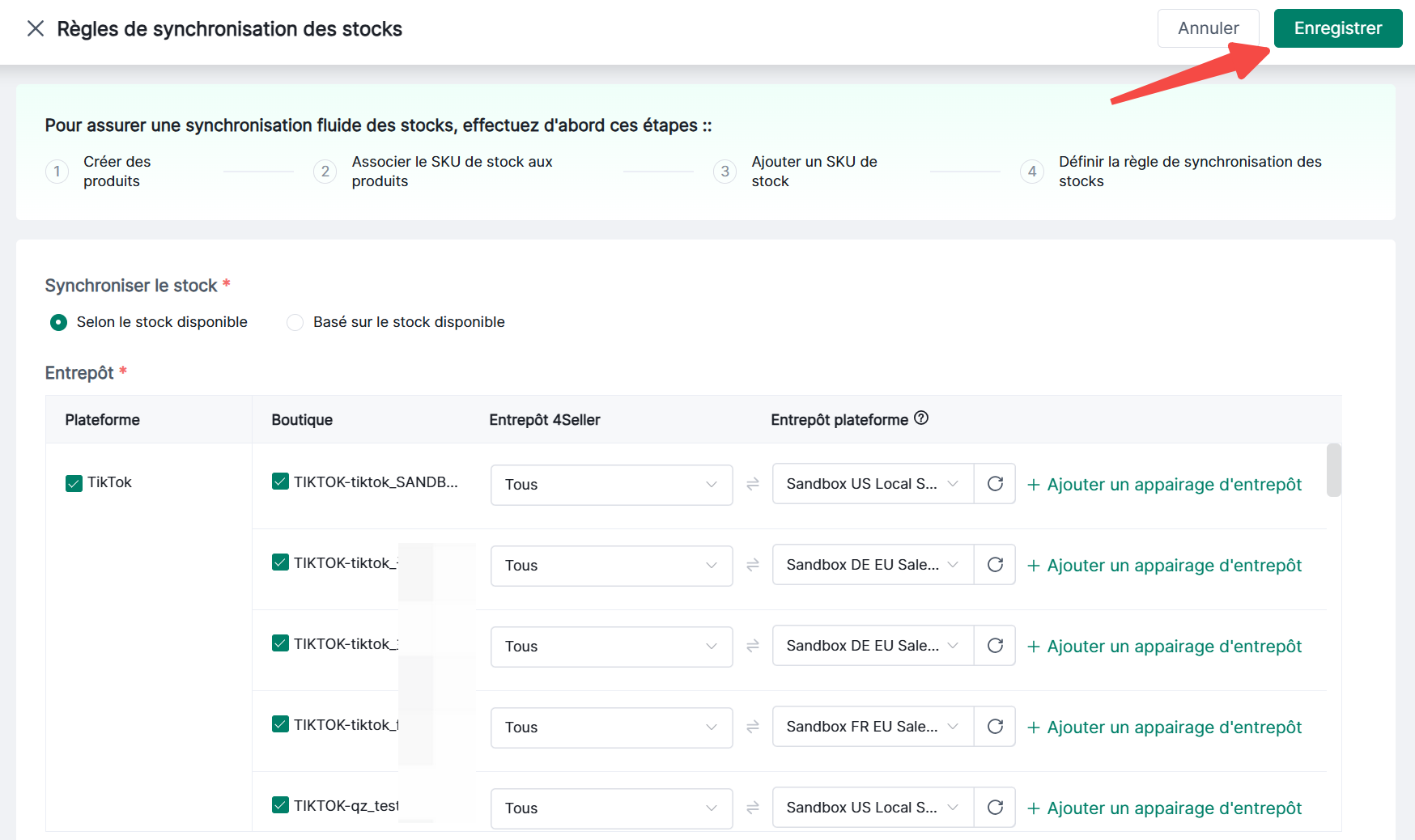 Remarque : comme la synchronisation des stocks mappe l'entrepôt du système à l'entrepôt de la plateforme, la synchronisation des stocks ne modifie que la quantité de l'entrepôt de la plateforme correspondant ;