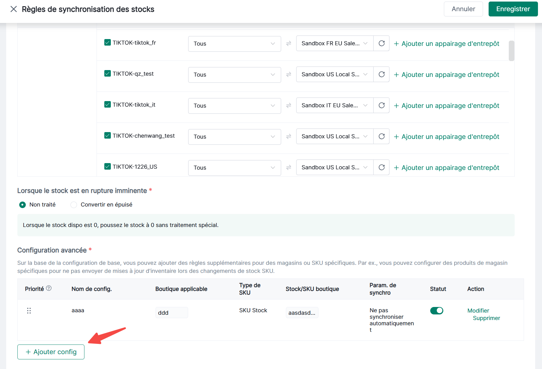 Configuration avancée : à partir de la configuration de base, vous pouvez ajouter des règles supplémentaires pour des magasins ou des références spécifiques. Par exemple, vous pouvez configurer certains produits en magasin pour qu'ils ne transmettent pas les mises à jour d'inventaire lorsque le stock d'une référence change.