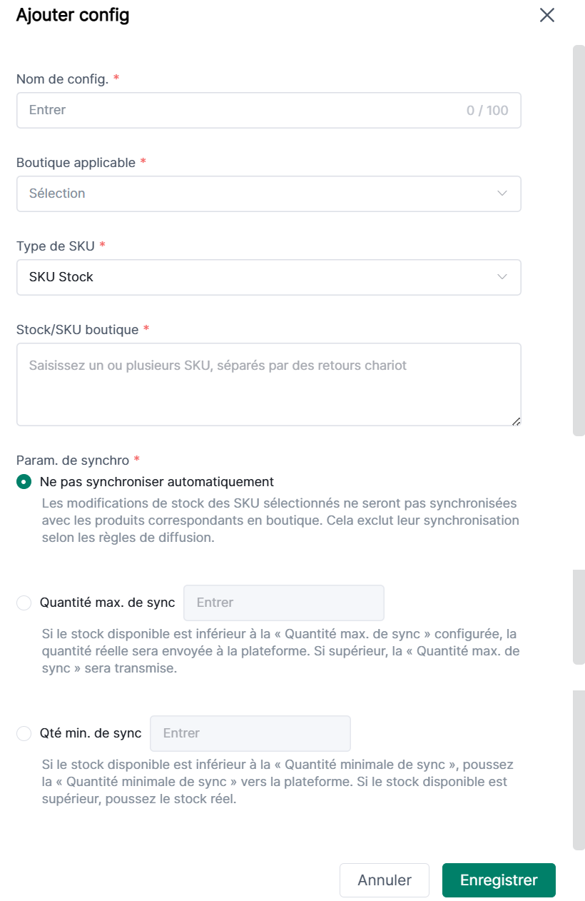 Ne pas synchroniser automatiquement : les modifications de stock pour le SKU sélectionné ne seront pas synchronisées avec les produits correspondants de la boutique.