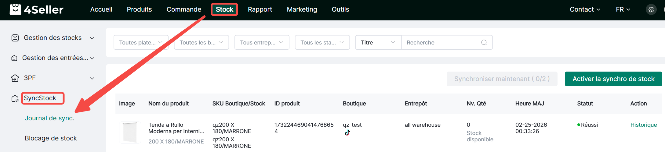 Après avoir défini les règles de synchronisation des stocks, vous pouvez afficher les enregistrements de synchronisation des modifications de stocks sur la page Synchronisation des stocks.