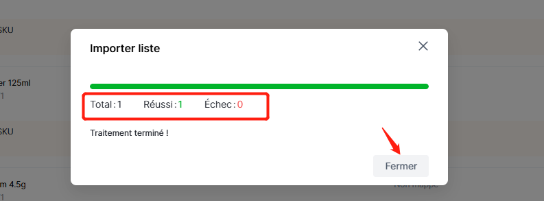 Une barre de progression s'affiche. Attendez son achèvement pour finaliser l'import. Consultez le nombre de produits importés sous la barre, puis cliquez sur Fermer.