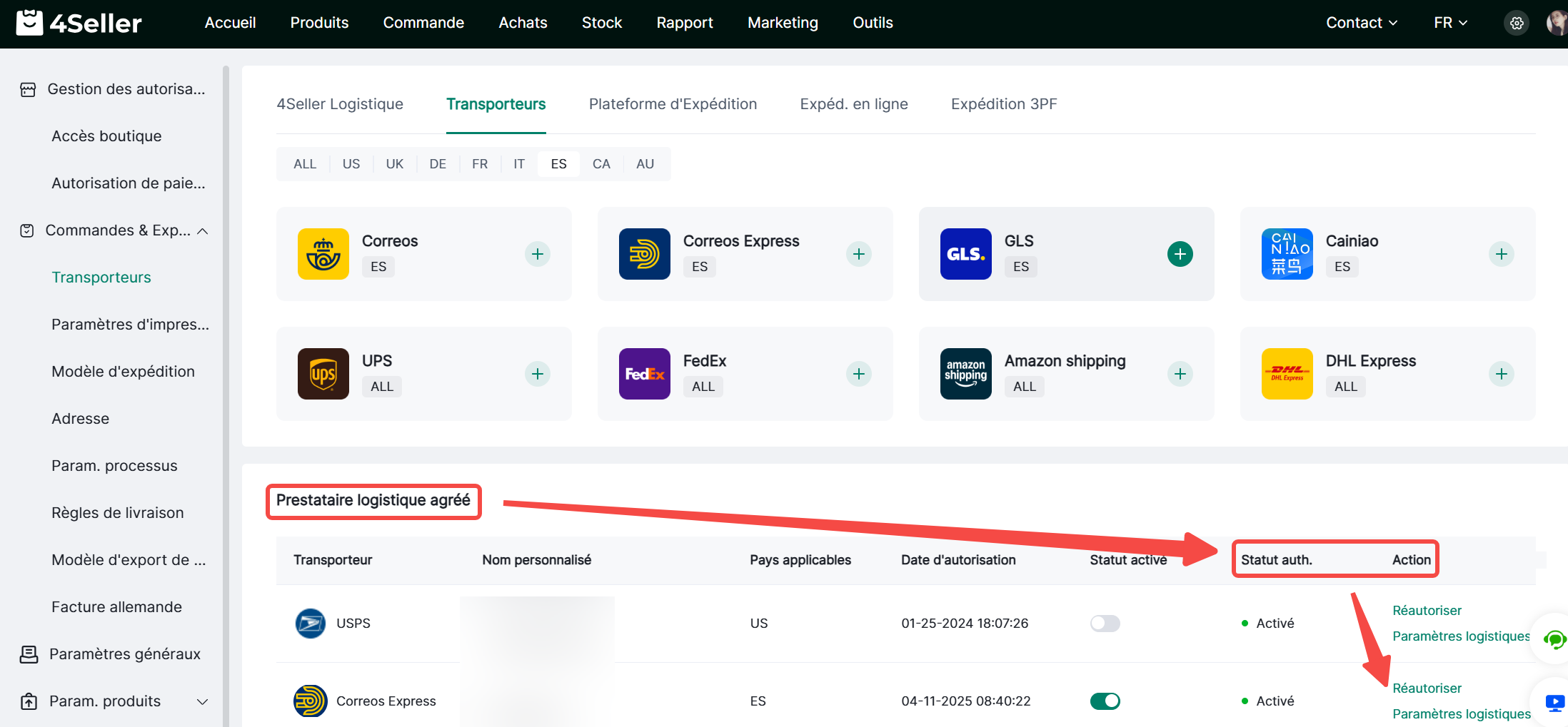 Une fois l'autorisation terminée, CORREOS EXPRESS apparaîtra dans la liste des prestataires logistiques autorisés. Vous pourrez alors gérer les expéditions des commandes.