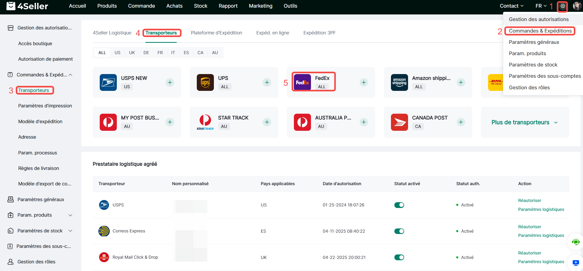 Étape 1 : Paramètres > Commandes & Expéditions > Transporteurs > FedEx