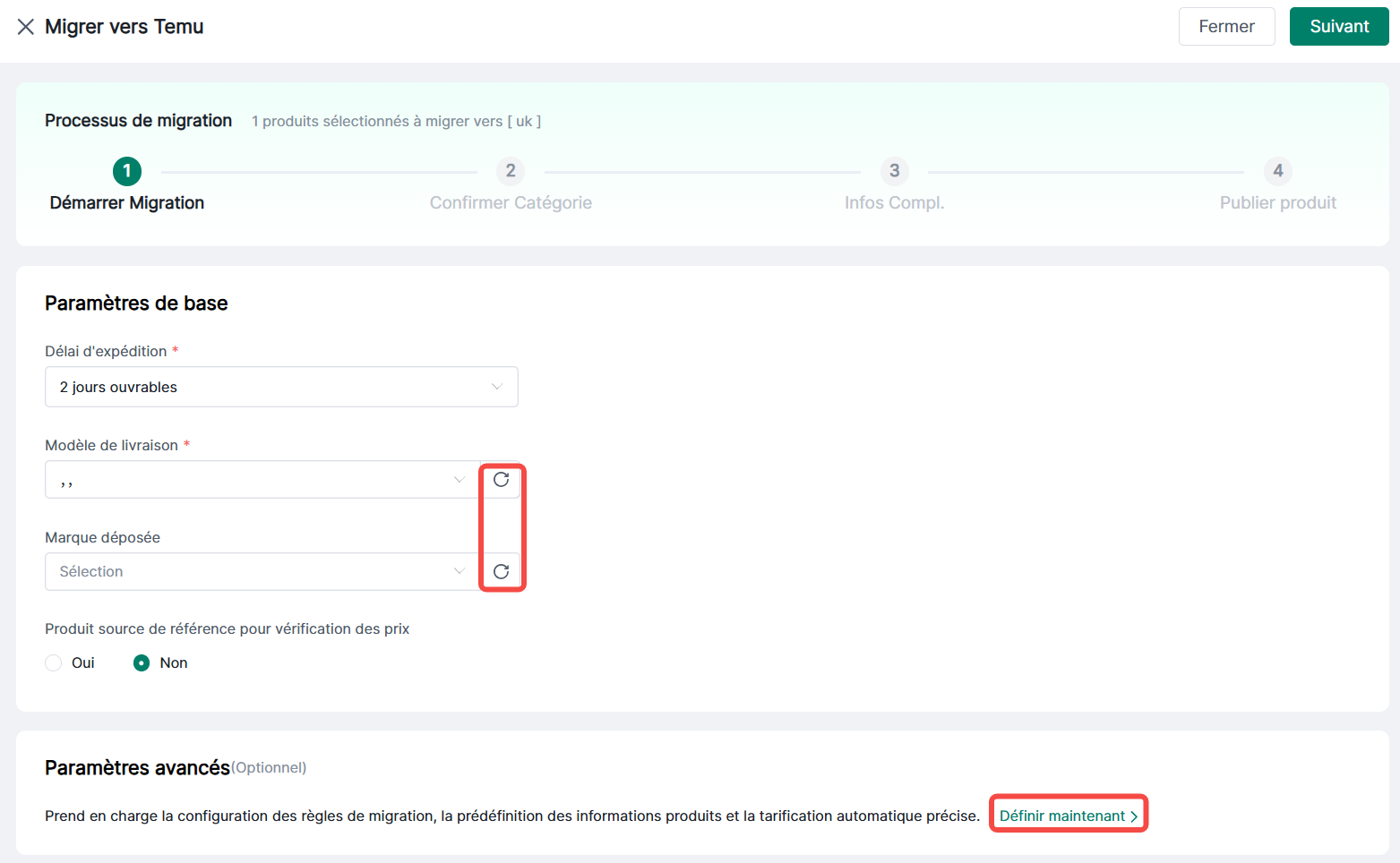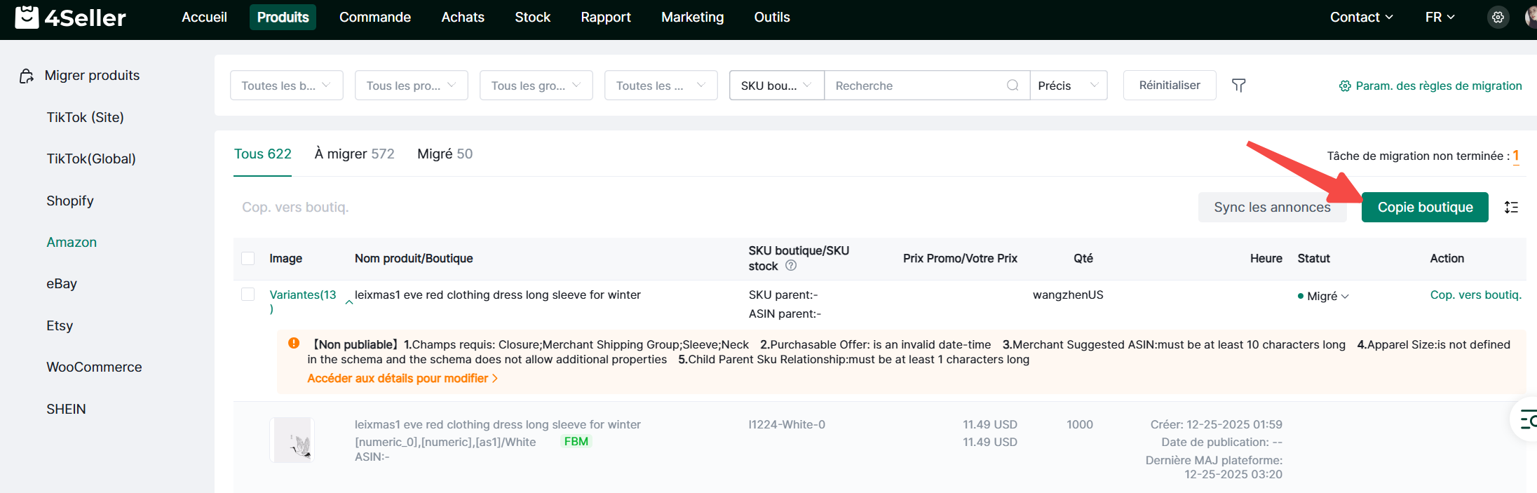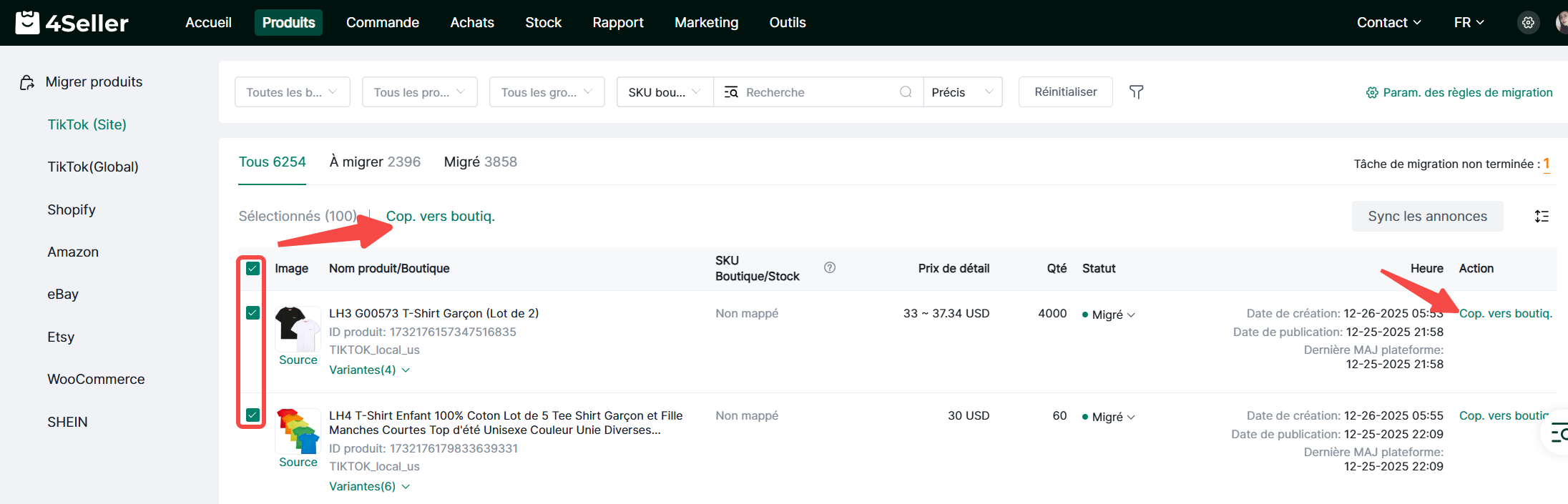 2. Migration de la boutique entière (disponible uniquement si le nombre de produits sur la plateforme est inférieur à 2000)